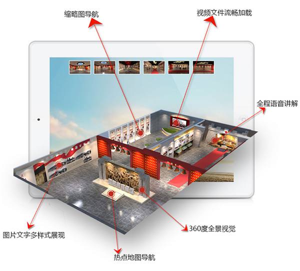 360度全景展館以傳統展館為基礎,利用計算機技術將展館及其陳列品移植到互聯網上進行展示、宣傳與教育活動,突破了傳統意義上的時間與空間的局限。360度全景在瀏覽中觀眾可以對圖像進行放大、縮小、移動觀看角度等操作,可以融入音、視頻、動畫等功能,經過深入的編程,還可實現場景中的熱點連接、多場景之間縮略圖導航、雷達方位導航等功能。