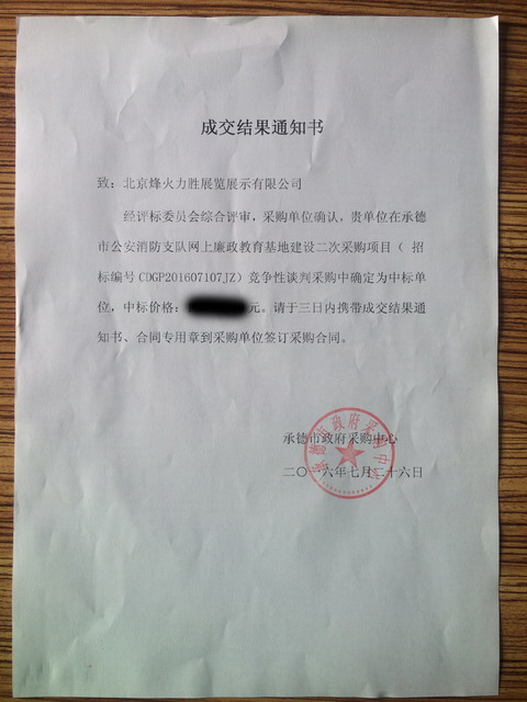 2016年7月26日,我公司在承德市消防支隊(duì)網(wǎng)上廉政教育基地建設(shè)項(xiàng)目競(jìng)爭(zhēng)性談判中以絕對(duì)優(yōu)勢(shì)勝出。
