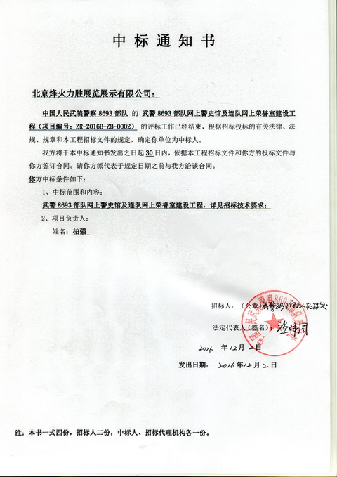 2017年8月29日,我公司在《武警通遼支隊(duì)網(wǎng)上榮譽(yù)室采購》項(xiàng)目招標(biāo)活動(dòng)中中標(biāo)。