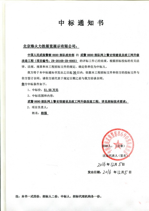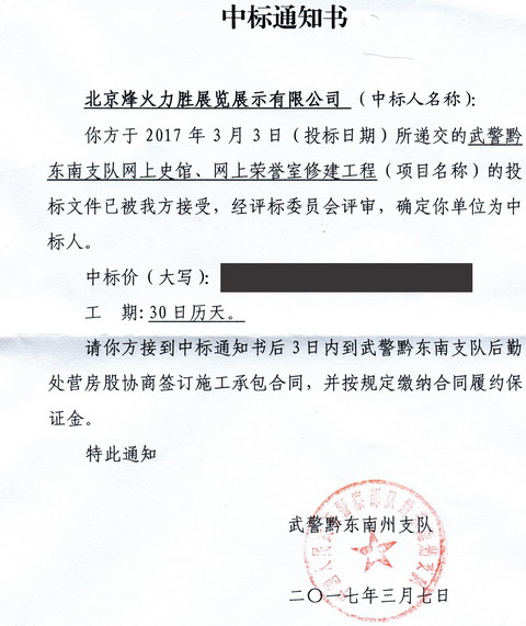 2017年3月7日,我公司在《武警黔東南支隊(duì)網(wǎng)上史館、網(wǎng)上榮譽(yù)室修建工程采購項(xiàng)目》項(xiàng)目招標(biāo)活動(dòng)中中標(biāo)。
