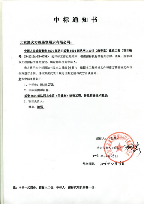 2016年12月23日,武警8694部隊(duì)網(wǎng)上史館中標(biāo)。