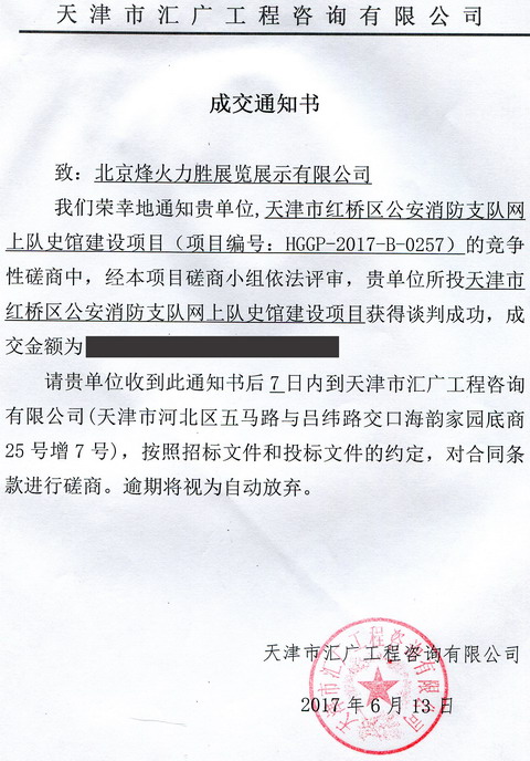 2017年6月13日,我公司在《天津市紅橋區(qū)公安消防支隊(duì)網(wǎng)上隊(duì)史館建設(shè)項(xiàng)目》項(xiàng)目招標(biāo)活動(dòng)中中標(biāo)。