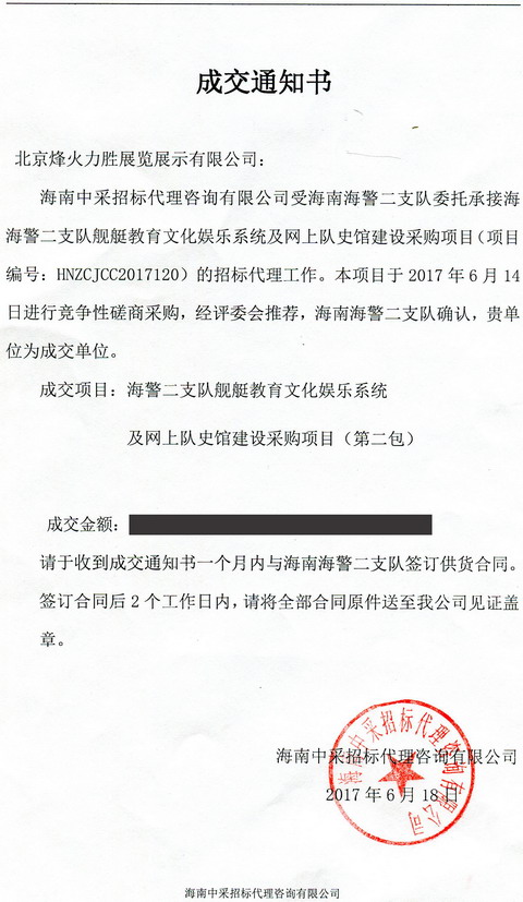 2017年6月18日,我公司在《海警二支隊(duì)艦艇教育文化娛樂系統(tǒng)及網(wǎng)上隊(duì)史館建設(shè)采購項(xiàng)目》項(xiàng)目招標(biāo)活動(dòng)中中標(biāo)。