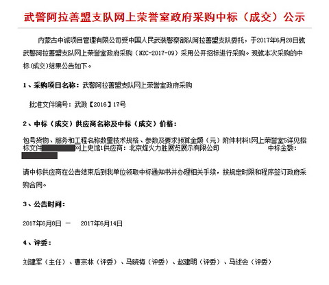 2017年6月29日,我公司在《武警阿拉善盟支隊(duì)網(wǎng)上榮譽(yù)室政府采購》項(xiàng)目招標(biāo)活動(dòng)中中標(biāo)。