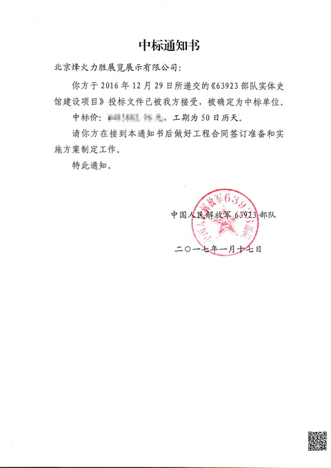 2017年1月17日,中國人民解放軍63923部隊(duì)史館項(xiàng)目中標(biāo)。