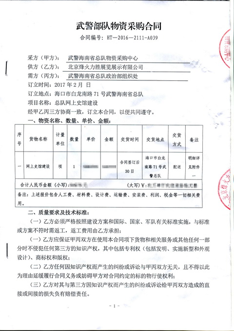 2017年2月1日,武警海南總隊(duì)網(wǎng)上史館項(xiàng)目簽定合同。