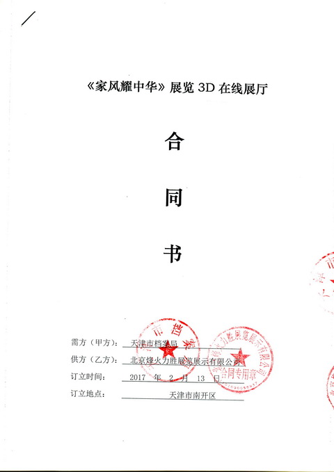 2017年2月15日,天津市檔案局“家風(fēng)耀中華”網(wǎng)上展館項(xiàng)目簽定合同。